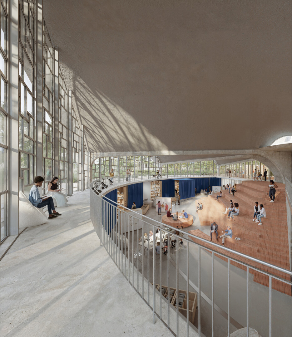 Around the facility, the circular garden matches the geometry of the building. Pathways run along the facades and lead to an outdoor theater, a reading garden, and a terrace opening onto the market square. These spaces are used for a variety of purposes and encourage daily interaction. The tree layer reinforces the existing canopy and creates a protective setting for the glass facades.