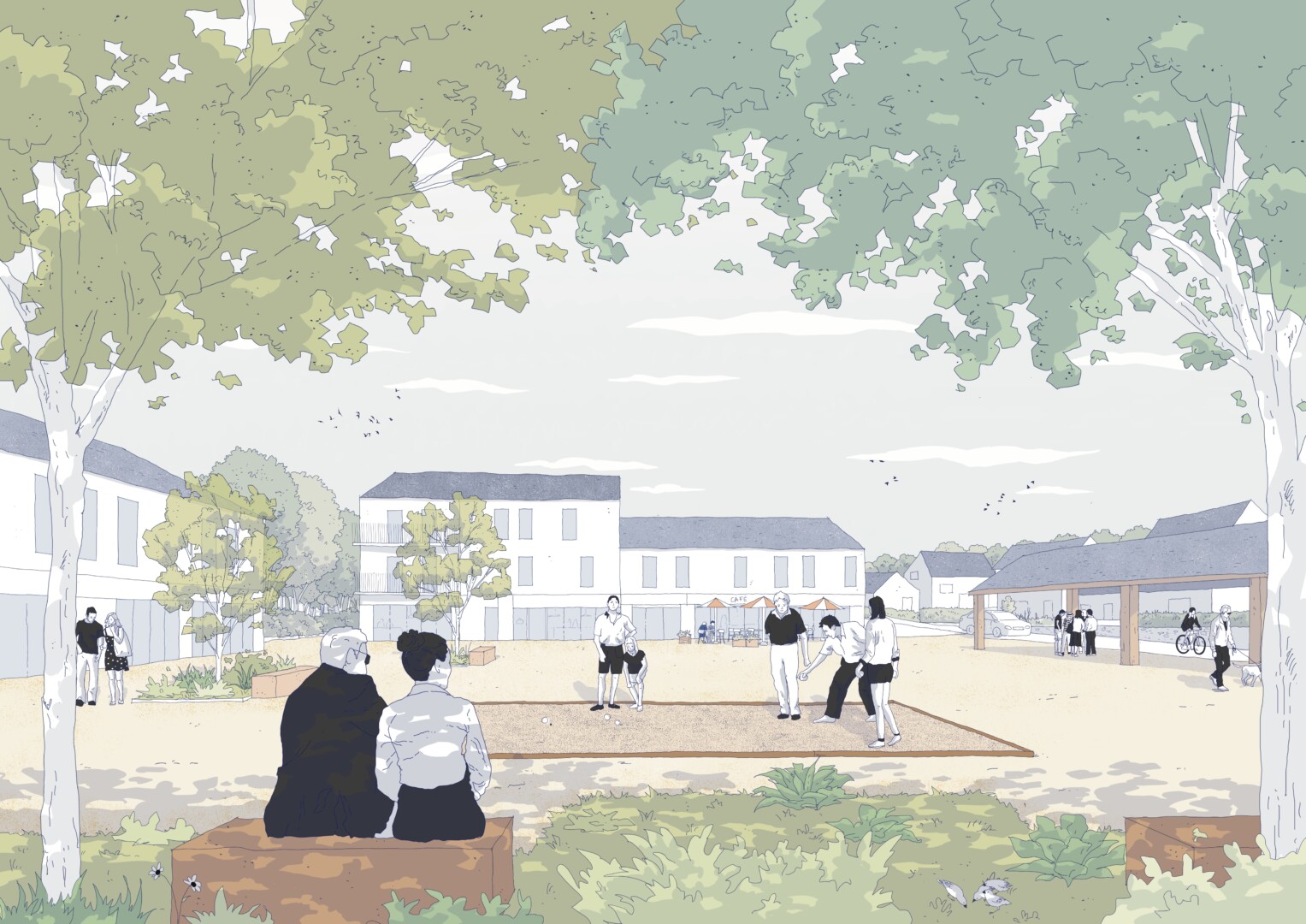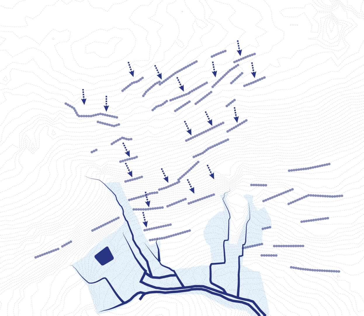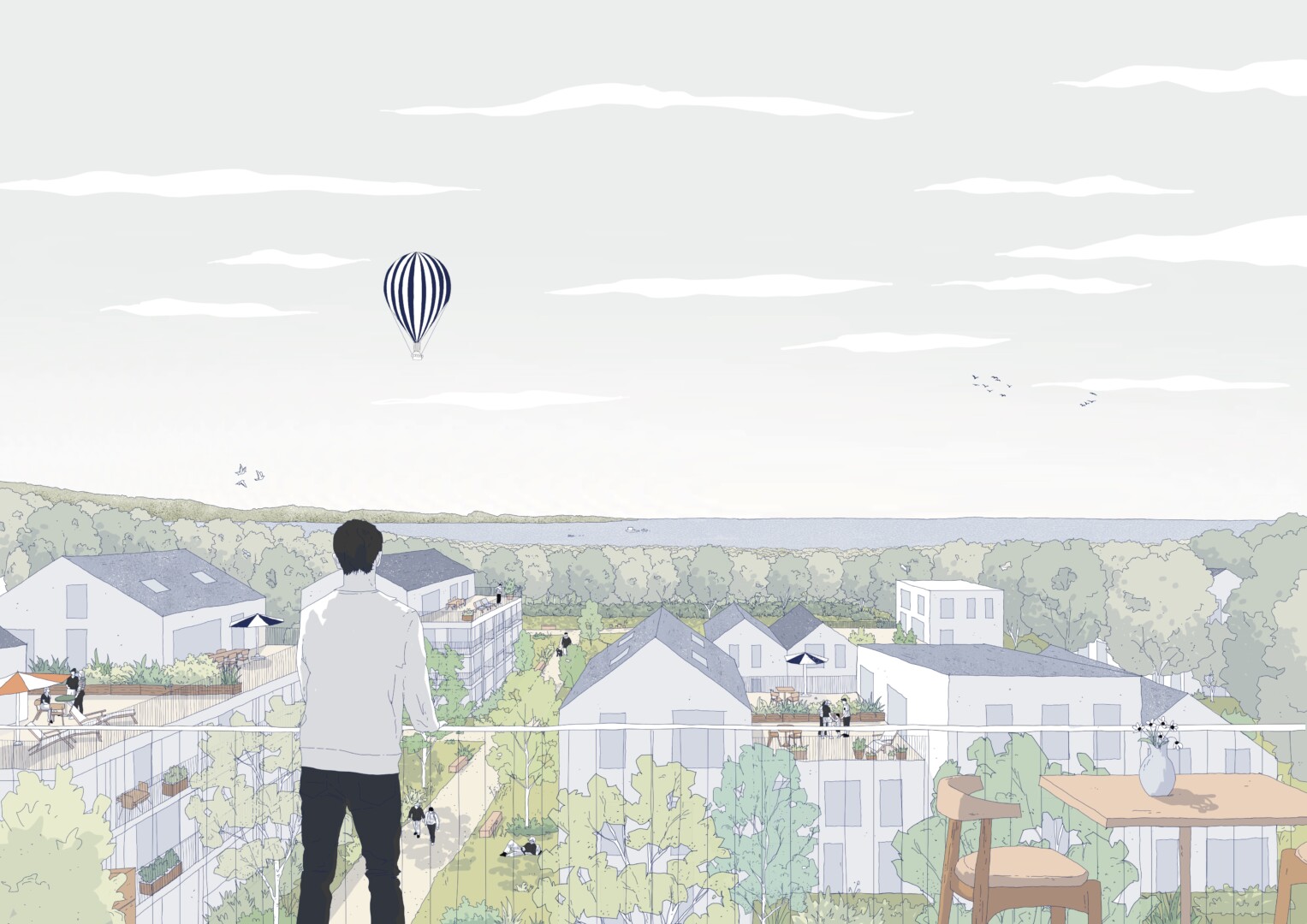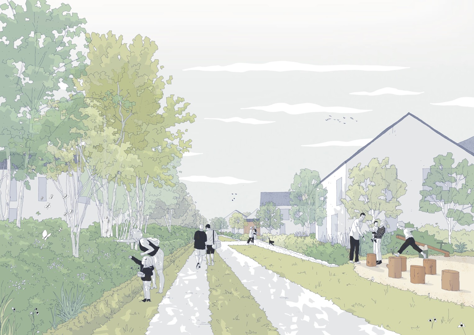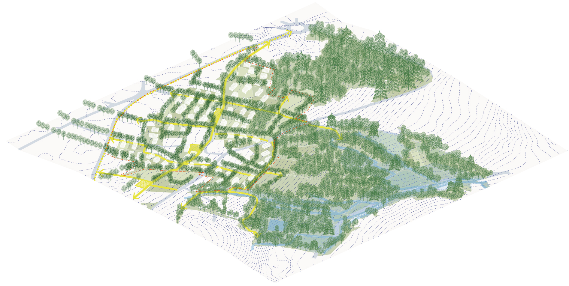 This master plan envisages the development of a residential neighborhood on a wooded hillside offering exceptional views of the Crozon peninsula. Given the heritage value of the wooded landscape, several areas have been designated as protected zones. The residential developments, built off-site, are delicately integrated into the “wooded alcoves” without altering the network of hedges. These alcoves form the basic unit of the urban project and define the scale of proximity for each neighborhood. The hedgerow infrastructure is expanding and extending into neighboring neighborhoods, structuring both a vast network of soft mobility and a runoff capture grid. #cut